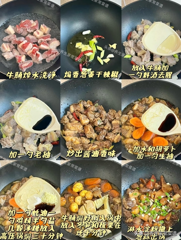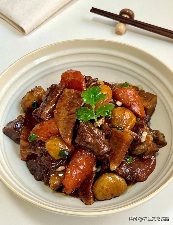 食材处理小技巧:牛腩切成大块,用冷水浸泡15分钟去血水,加姜片和料酒焯水,去除腥味;冬笋切成块,用沸水焯3分钟,去掉涩味;板栗用热水泡5分钟,剥壳更轻松。