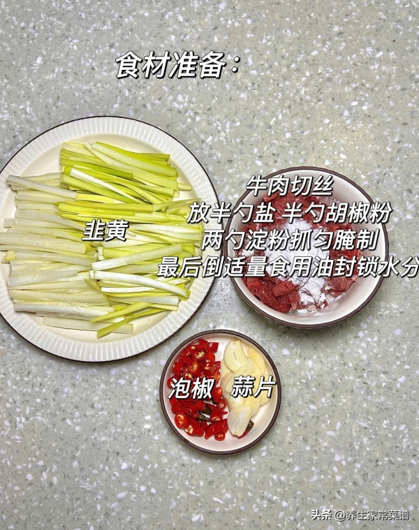 食材处理小技巧:牛肉逆着纹理切薄片,加一勺生抽、半勺淀粉和少许食用油抓匀,腌制10分钟,炒出来更嫩不柴;韭黄洗净后控干水分,切成段,炒的时候大火快炒,避免出水变软。
