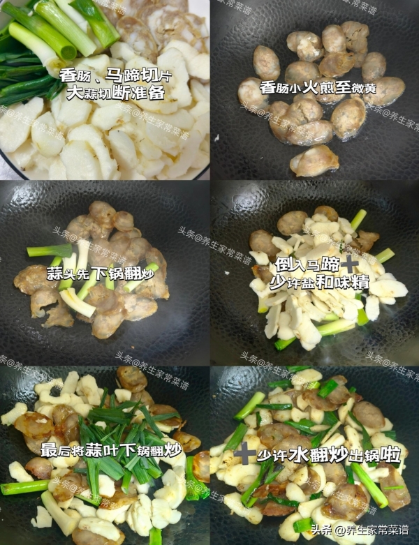 食材处理小技巧:马蹄用刷子在流水下刷干净,带皮煮5分钟再剥壳,又快又干净;香肠先蒸10分钟再切片,炒的时候不油腻,还能去掉多余咸味。