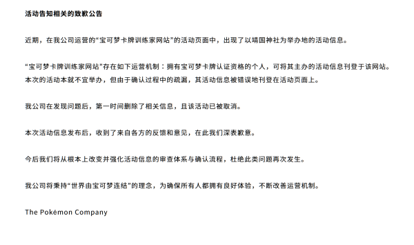 但宝可梦公司承认:"本次的活动本就不宜举办,但由于确认过程中的疏漏,其活动信息被错误地刊登在活动页面上。我公司在发现问题后,第一时间删除了相关信息,且该活动已被取消。本次活动信息发布后,收到了来自各方的反馈和意见,在此我们深表歉意。"