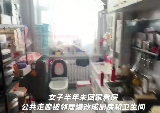 内蒙古的一位女子半年没回家,回到家,却差点找不到门,因为发现公共走廊被人装修了!