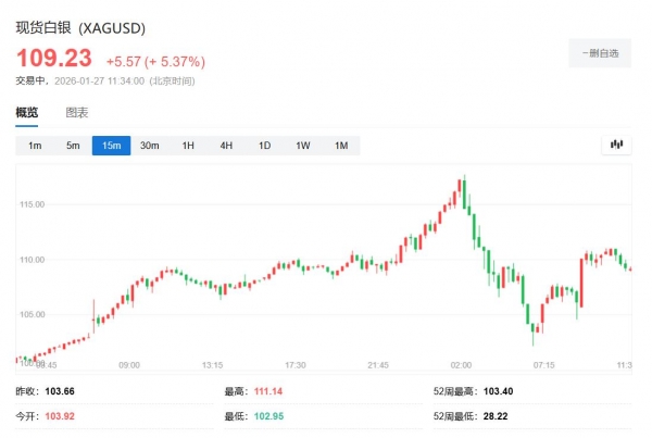 白银表现更为抢眼,周二反弹至每盎司110美元上方,此前一日创下117.69美元的历史新高后几乎回吐全部涨幅。这一白色金属今年迄今已暴涨55%。