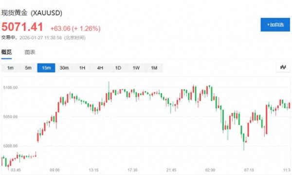 周二现货黄金上涨1.26%至每盎司5071.41美元,此前一日曾触及5110.50美元的历史高位。美国2月期金上涨0.4%至5063.0美元。黄金在过去两年内价格翻倍,今年以来已累计上涨17%。