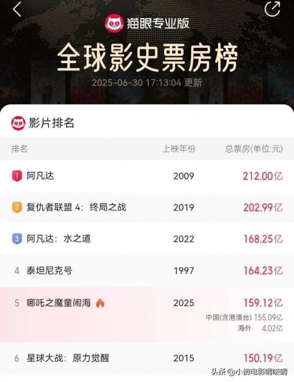 轻松登顶中国影史票房冠军,并且还创造历史,杀进全球票房前五。