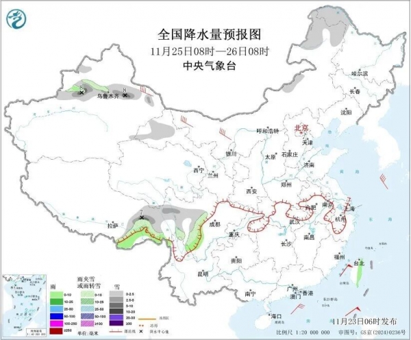 后天,新疆沿天山地区、甘肃北部、内蒙古东北部、黑龙江西北部、川西高原中部、西藏东部等地部分地区有小到中雪或雨夹雪,其中,新疆沿天山地区、西藏东北部等地局地有大雪;西藏东南部、四川盆地西南部、四川南部、台湾岛东部等地部分地区有小雨。