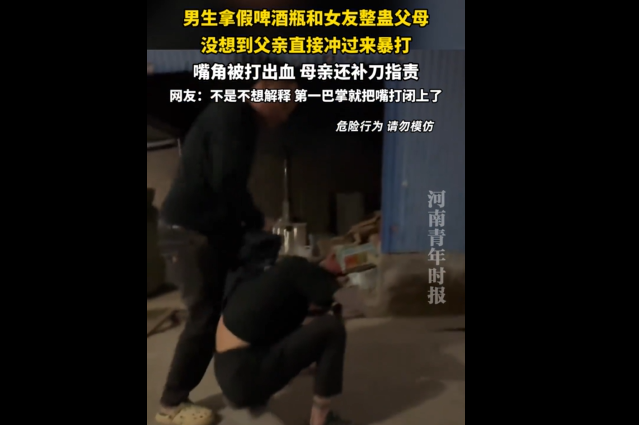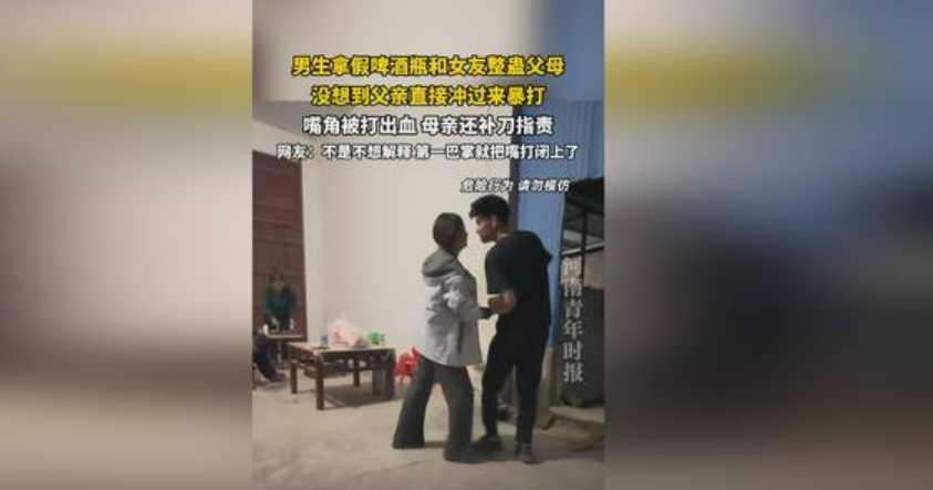 据视频内容及网友爆料,事发时男子与女友一同在女方家中,两人计划用道具假啤酒瓶,模拟男子 "酒后失控砸自己头" 的场景,以此整蛊女友的父母。在男子做出 "砸头" 动作后,女友的父亲瞬间被激怒,完全没有意识到这是一场玩笑,当即冲上前对男子挥拳殴打,男子当场被打得嘴角出血,而女友的母亲也在一旁对男子进行指责,场面一度十分混乱。
