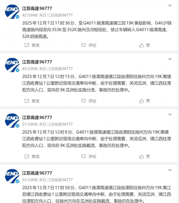现场单向中断,关闭江苏上党站收费站往扬州方向入口,关闭江苏镇江南站收费站往扬州方向入口,关闭江苏镇江西站收费站往溧阳方向入口,事故正在处理中。