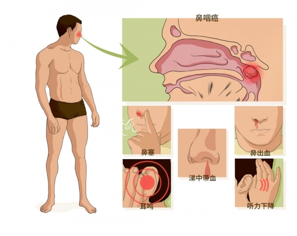 鼻咽癌的主要症状为"流鼻血",不过这种流鼻血与抠鼻子造成的流鼻血不一样,而是"回吸性涕血",也就是早上的第一口痰中有偏黑色的淤血,并且这种情况持续出现、逐渐加重,就要警惕鼻咽癌。