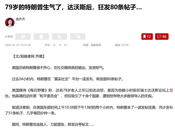 据观察者网1月23日报道,特朗普在瑞士达沃斯论坛上受挫后,24小时内接连发布、转发超80条帖子。期间有两个小时,特朗普发了51条帖子,几乎每四分钟一条。
