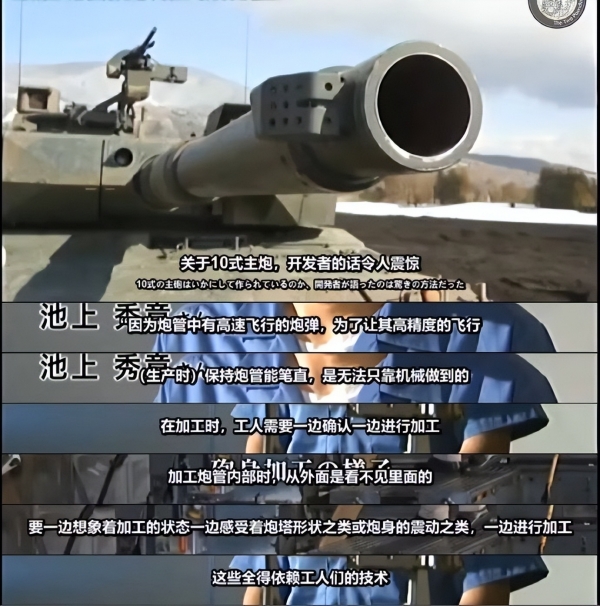 说到10式坦克这门炮,此前还有日本媒体专门制作过一档节目,就是吹这门炮的研制工艺有多么多么精良的。据负责相关工作的日本匠人介绍,为了确保出膛的炮弹能以高精度飞行,炮管在加工时必须保证尽可能笔直,日本人认为要做到这一点是不能靠机器的,只能靠手工。