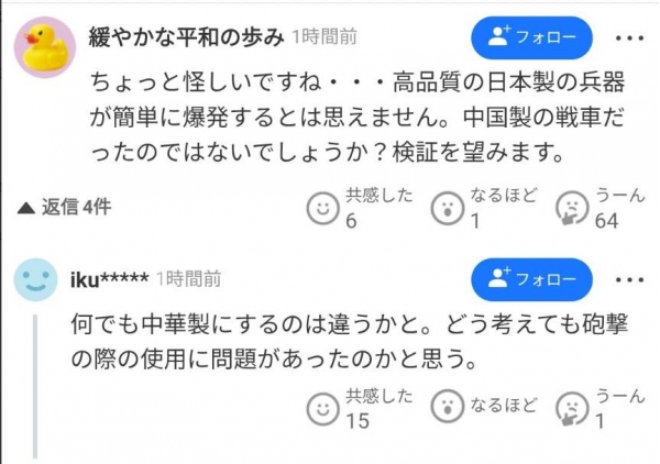 出了家丑也就算了,关键日本人还死不承认。在臭名昭著的日本网络右翼粪坑"日本雅虎网"上,事发当天就有日本网右冲我们哈上气了。说什么陆自这起坦克炸膛事故着实可疑,因为众所周知,日本制造的武器装备素以"精良"著称,绝不可能轻易发生事故。此次事发蹊跷,更可能是事故坦克使用了中国制造的零部件。