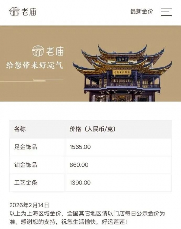 单日上涨27元;老庙黄金足金饰品报1565元/克,较前一日1529元/克单日上涨36元;老凤祥报价1548元/克,单日上涨10元/克。