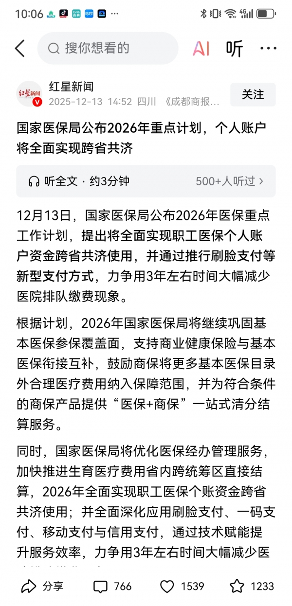 此外,利好消息接踵而至!2026年起职工医保个人账户将实现跨省共济,我们参保人能把账户里的钱共享给配偶、父母、子女这些家人。哪怕一家人天各一方、分处不同省份,也能直接用这笔钱看病、买药、缴医保费。这政策一举打破了医保资金的地域限制,给长期异地生活的家庭送去了实实在在的便利。
