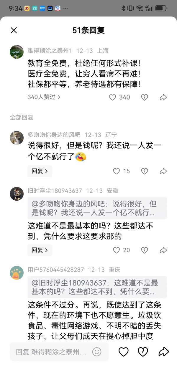 值得注意的是,新闻下面有很多阴阳怪气以及求全责备的评论,比如,什么零首付上车、教育全免费,杜绝仼何形式补课!医疗全免费,让穷人看病不再难!社保都平等,养老待遇都有保障等,不知道是何用意。其实国家层面应该知道大多数老百姓的想法和担心,虽然养孩子更费钱费时间,但任何政策不可能一蹴而就,要逐步落实,也不可能让国家大包大揽承担所有个人的问题,这是不现实的。