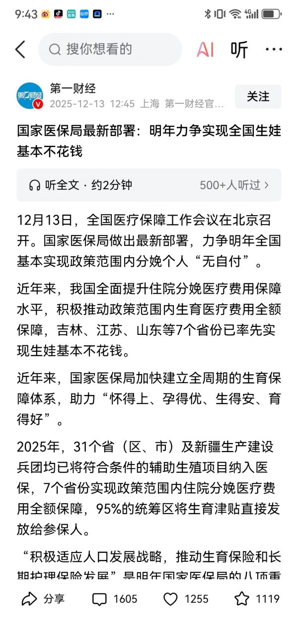 事实上,如今国家为生育开道的各项配套政策以及制度已经比较完善了。特别是医保新政落地生育"零自付",直击家庭生育成本痛点,是提振生育意愿的有力抓手和重要里程碑,值得叫好。而网友期待的"一步一步来,先是生娃基本不花钱,孩子上幼儿园不花钱,以后会逐步到小学,初中甚至高中大学不花钱"将来也不是不可能。随着一系列政策体系的不断健全,加上社会观念的积极引导,或许能让更多年轻人从"不敢生"转向"敢生愿养",为人口发展注入持久动力。