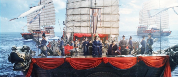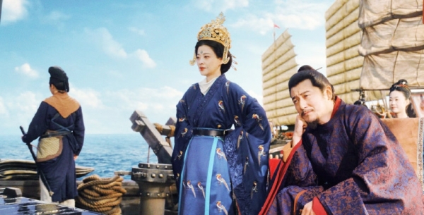 再看孙太真与钱弘俶的大婚,更是震撼全网。周雨彤饰演的孙太真,身着华丽婚服,娘家直接送三艘战船当嫁妆,霸气侧漏!网友调侃:"这嫁妆能灭国,以后吵架都得掂量掂量!"隔海跪拜、九钿三翅冠、战船列阵,细节拉满,既还原五代礼制,又拍出乱世儿女的家国担当。