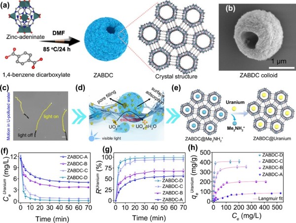 在铀离子提取应用中,ZABDC微马达展现出卓越性能。该材料在可见光照射下对铀的吸附容量高达406 mg/g,在复杂盐湖卤水基质中的分配系数(Kd)达1.0×10⁴ mL/g。特别值得关注的是,吸附于表面的铀酰离子在光催化下进一步转化为亚稳态的晶质铀矿纳米颗粒,实现了从溶解态到固态的有效固定与分离。