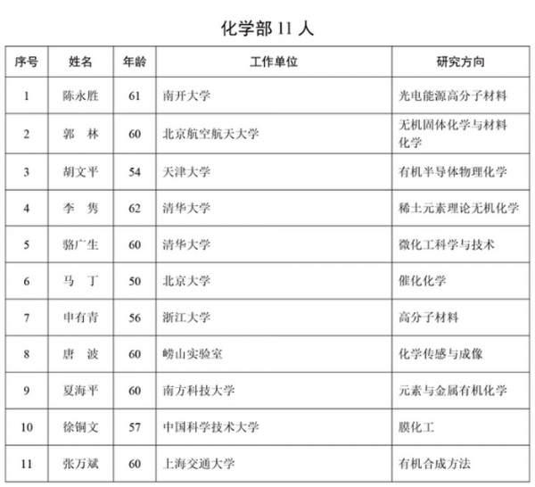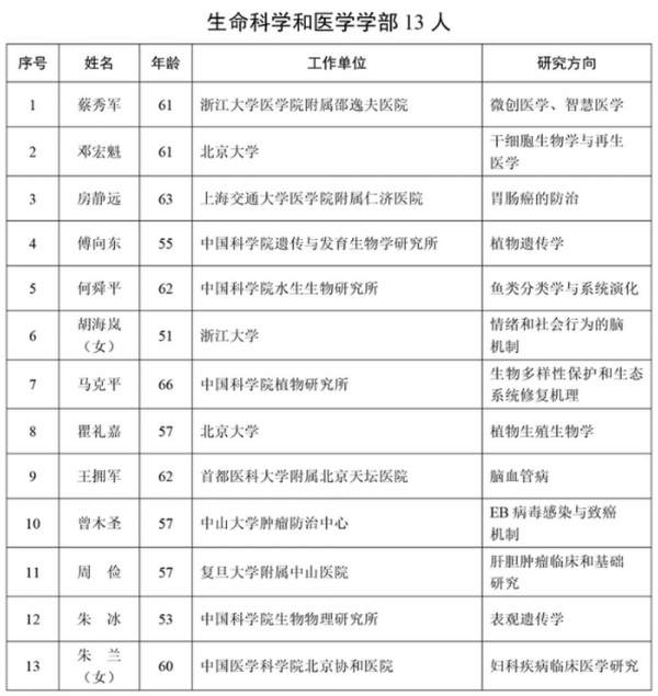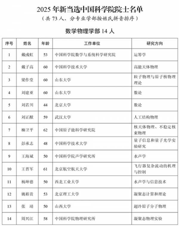 2025年共选举产生中国科学院院士73人。其中,数学物理学部14人,化学部11人,生命科学和医学学部13人,地学部9人,信息技术科学部11人,技术科学部15人。新当选院士平均年龄57.2岁,最小年龄44岁,最大年龄66岁,60岁(含)以下的占67.1%。女性科学家有5人当选。院士队伍的结构进一步优化。本次增选后,中国科学院共有院士908位。2025年新当选中国科学院外籍院士27人,来自15个国家,外籍院士的国别分布更加广泛。本次选举后,中国科学院共有外籍院士173位。