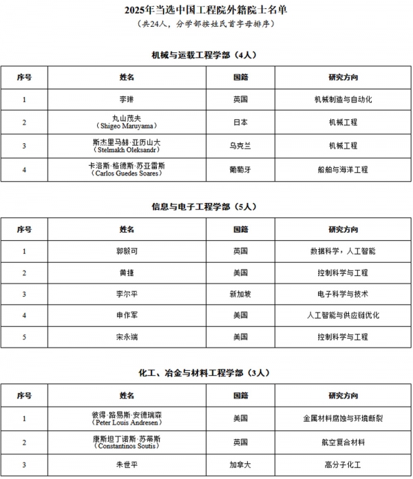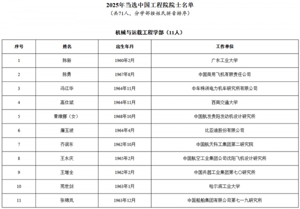 2025年共选举产生中国工程院院士71人。其中,机械与运载工程学部11人,信息与电子工程学部9人,化工、冶金与材料工程学部10人,能源与矿业工程学部12人,土木、水利与建筑工程学部7人,环境与轻纺工程学部6人,农业学部8人,医药卫生学部8人。此次中国工程院院士增选中,女性科学家有8人当选,还有一批国防和国家安全领域承担重大任务的专家、多位民营科技领军企业的专家以及6位扎根西部边远地区的优秀专家当选。本次增选后,中国工程院共有院士1002位。2025年新当选中国工程院外籍院士24人。本次选举后,中国工程院共有外籍院士148位。