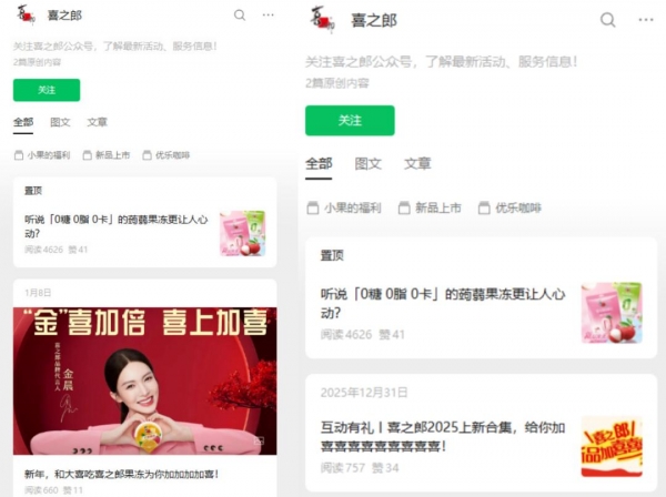 此前于1月7日,该账号曾置顶发布金晨代言宣传,并配文"喜之郎喜上加喜组合"并@金晨的个人微博。