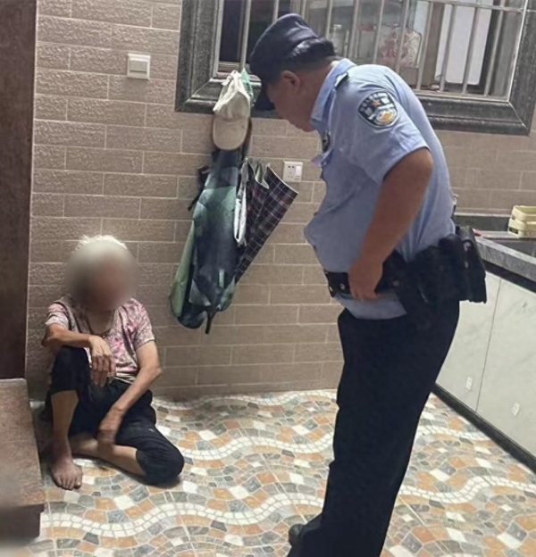到场后,民警发现一白发老奶奶正靠在墙上赤脚席地而坐,马上上前查看老人身体状况,并向其询问。但老人无法准确说出家人信息及家庭住址。