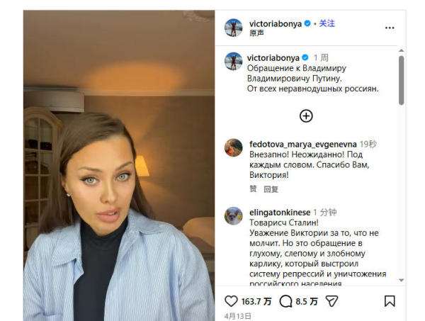 4月14日,博尼亚在Instagram上发布了一段约19分钟的视频,向普京谏言。她称,这段视频是"代表人民"与普京的对话,而她决定公开讲话,是因为普通民众和总统之间存在着一道"巨大而厚重的墙"。