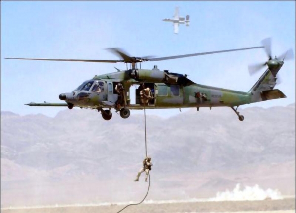 ▲无人黑鹰先于作战部队抵达作战地域投放车辆物资
