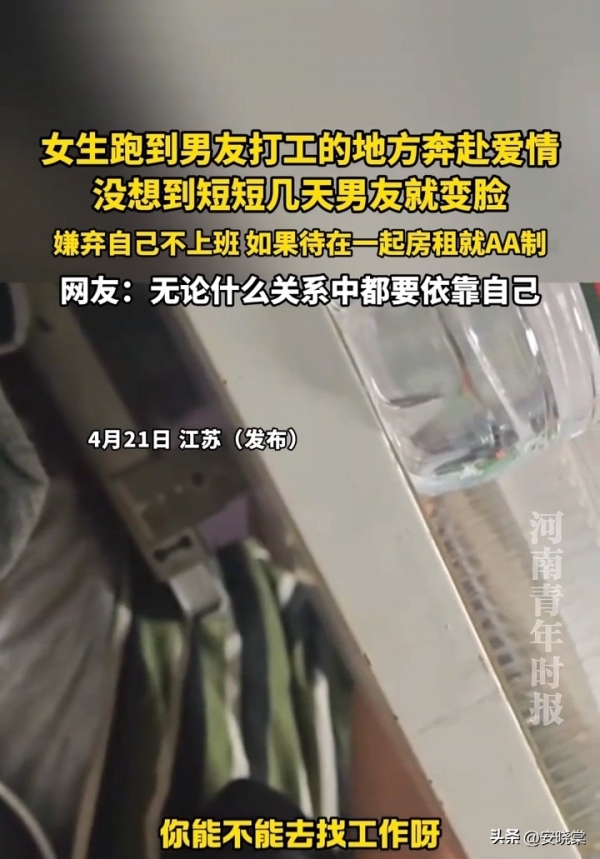 近日,江苏,一女生跑到男友打工的地方奔赴爱情,没想到第四天就想让她A房租,嫌弃她不上班!