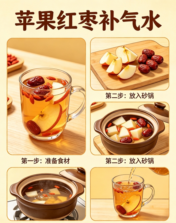 准备苹果1个、红枣3颗、红糖少许。苹果洗净切块,红枣去核洗净。一同放入锅中,加水煮20分钟,最后加少许红糖融化即可。