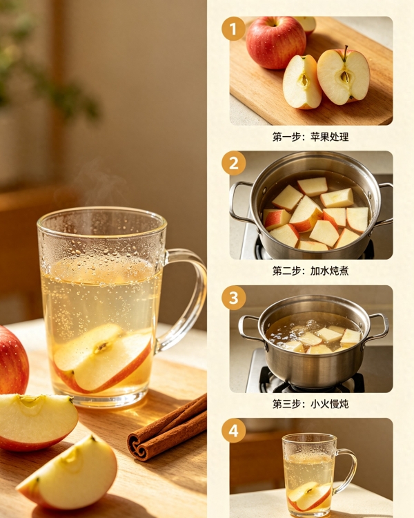 准备苹果1个、清水适量。苹果用盐搓洗干净,连皮带核切成小块。锅中加足量水,放入苹果块,大火煮开后转小火煮15分钟,煮至果肉变软、汤色微黄即可,温热饮用。