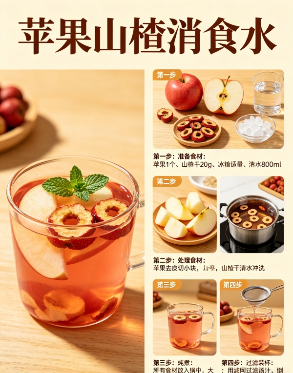 准备苹果1个、山楂干5片、清水适量。苹果切块,和山楂一同下锅,小火煮20分钟,酸甜适口,不用额外加糖。