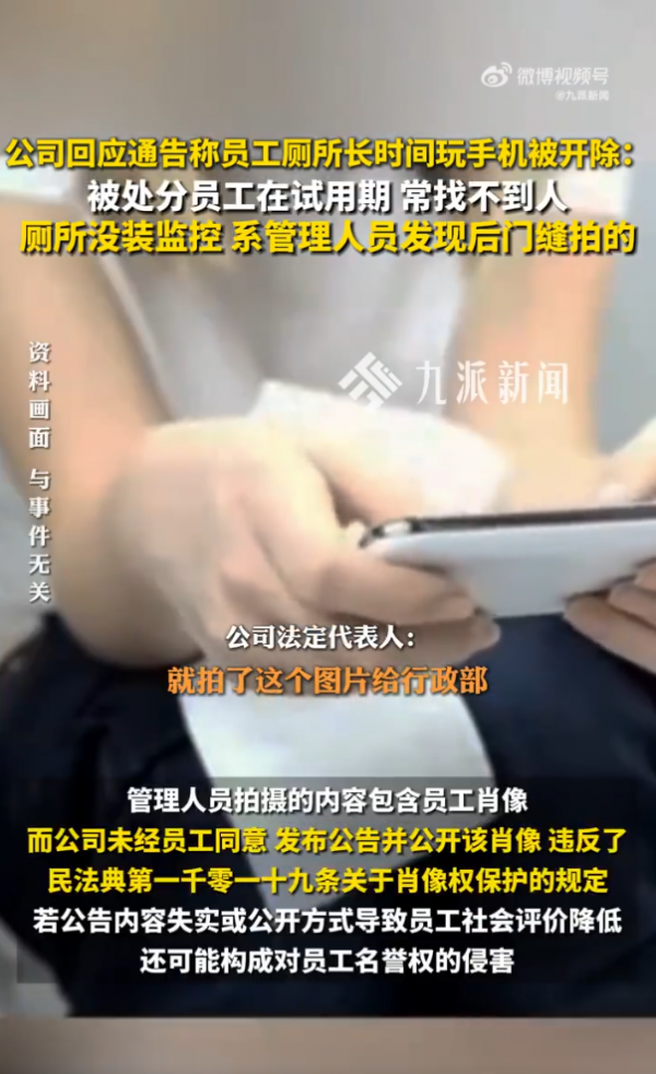 近日,一份由广东某科技集团有限公司落款盖章的《通告》显示,一名员工因长时间滞留厕所使用手机被扣除绩效200元并解除劳动合同。通告中展示了涉事员工在卫生间内使用手机的照片。4月27日,该公司法定代表人向九派新闻记者表示,通告内容属实,但公司没有在厕所装监控,相关图片是由公司管理人员发现涉事员工在厕所内玩手机后通过门缝拍摄而得。