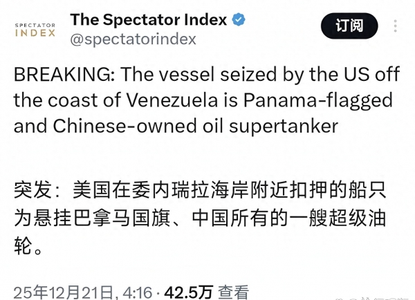12月20日凌晨,美国出动海岸警卫队,在加勒比海强行扣押了一艘超级油轮。美白宫副新闻秘书凯利在行动以后,对外做出解释,声称这艘油轮属于委内瑞拉的"影子团队",船上装载的是"偷运的石油"。看似有理有据,实则是无理取闹。美国的这一次剑锋所指,并非是委内瑞拉的"影子团队",而是我国......