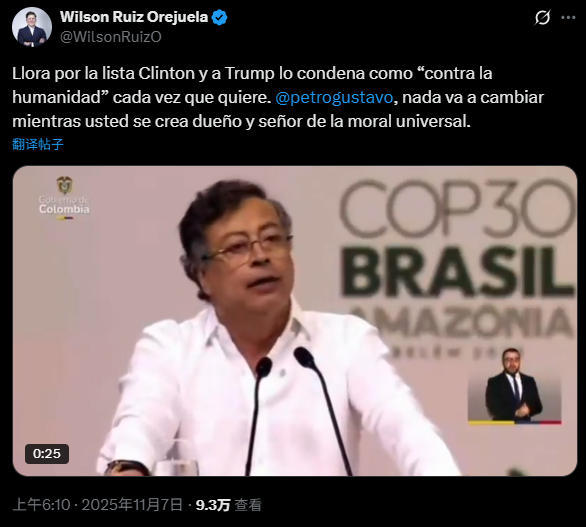 佩特罗6日发表演讲,炮灰特朗普"反人类" 推文截图
