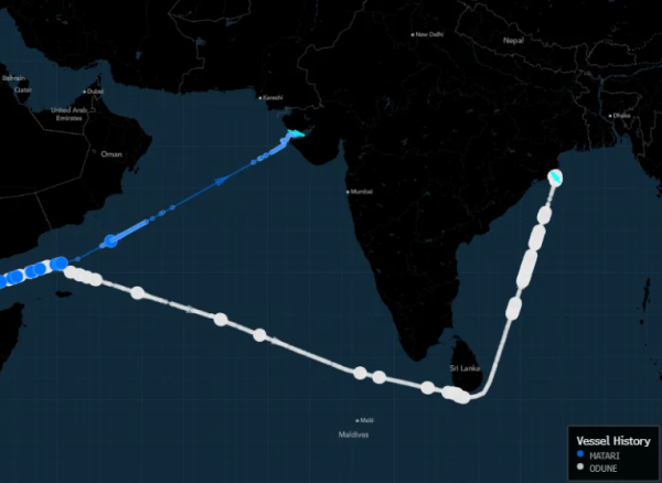 冲突爆发后,Odune(白色)和Matari(蓝色)油轮将目的地改为印度。 彭博社