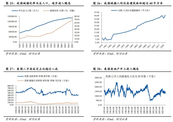 2026年地产展望:房地产进入新阶段,对经济的拖累逐渐缓减。国际经验显示,房价涨跌皆为周期。BIS的数据显示,美国、日本、德国、中国香港等经济体均在大涨见顶后,出现过较长时间的房价调整期。参考可比经验,房价从见顶开始往往调整3-7年不等,调整幅度无明显规律;若遭遇金融危机等重大冲击,房价调整时间更长、幅度更大。根据BIS数据,中国房价从2021年3季度见顶到数据截至的2025年2季度已有45个月,累计下跌17.8%,在时间维度上已经进入探底阶段。结合房价、库存周期及政策动态来看,我们预计未来商品房销售面积降幅将逐步收窄,并有望带动房地产开发投资逐步接近底部区间。中性、乐观情景下,2026年房地产开发投资总额同比分别下降9%、3%,分别对固定资产投资大约拖累1.5个百分点、0.5个百分点。长期来看,伴随着我国城镇化过渡到稳定发展期,房地产将进入高质量发展的新阶段,依然是经济的重要支撑。