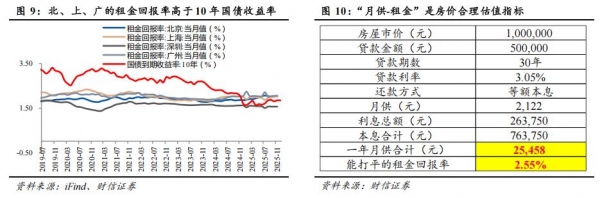 政策呵护下我国房地产市场降幅有望逐步收窄。展望未来,房地产的止跌回稳需增量宏观政策层面的进一步支持,包括降低个人住房融资成本及部分一线城市加大放开限购力度,并关注落实城中村改造和存量房收储。从租金回报率来看,2025年11月北京、上海、广州的租金回报率分别为2.01%、2.02%、2.05%,均已高于10年期国债收益率。其中,深圳的租金回报率明显低于北京、上海、广州,是房价基数较高、城中村低租金房源占比较高、保租房供应量较大等原因导致的。以更直观的购房者视角来看,我们认为核心在于比较月供与租金两个变量,当月供小于租金时购房划算,反之则租房划算。