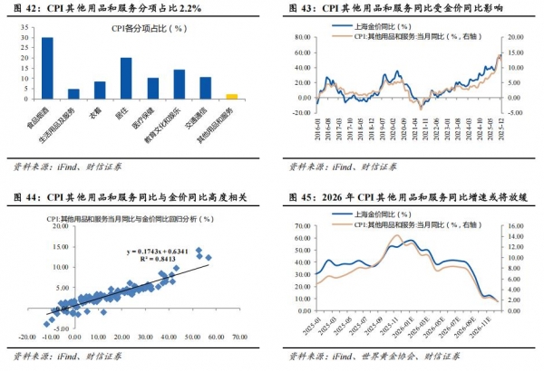 ①金价涨势延续但会放缓,CPI其他用品和服务同比增速在基数效应影响下前高后低。从2022年开始至2025年,过去四年上海黄金现货价格的年度涨幅分别为10%、17%、28%、59%,导致CPI其他用品和服务同比对CPI的同比拉动率明显提升。世界黄金协会的预测显示,中性情景下,经济增长放缓、主要央行货币政策宽松以及持续的地缘政治风险等因素,2026年黄金价格有望迎来5%-15%的涨幅。基于此,暂不考虑汇率与内外价差的走势变化,我们预计2026年上海黄金现货价格中枢或在1050元/克附近,高点或在1100元/克附近,同比增速前高后低,对应2026年CPI其他用品和服务同比增速从10%以上的位置逐步下降到2%以内。