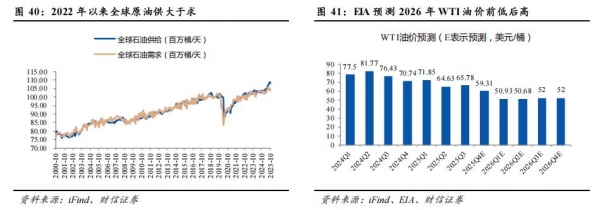 与生猪类似,2026年原油供应压力主要体现在上半年,全年价格运行节奏大概率前低后高,对CPI的拖累将逐步降低。2022年以来,尽管地缘局势变幻莫测,但是供需变化才是主导油价长期走势的核心变量。EIA(美国能源信息署)的数据显示,2022年以来全球原油整体上供大于求,WTI原油价格持续回落。EIA预测,2026年上半年全球原油的供应压力将明显增大,下半年将有所缓解,2026第一季度、第二季度、第三季度、第四季度的油价均价分别为50.93美元/桶、50.68美元/桶、52美元/桶、52美元/桶。