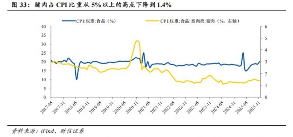 猪价方面,对CPI食品分项同比走势依然产生较大的影响,关注2026年猪价运行节奏。国家统计局每五年会根据居民消费支出结构的变化对权数体系进行全面更新,曾多次下调食品、猪肉分项占CPI比重。尽管目前猪肉占CPI比重从5%以上的高点下降到1.4%,但占CPI食品分项的比重依然达到7%,依然是影响食品分项走势的核心变量。