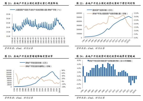 同时,房地产开发占固定投资比重在过去5年已明显降低,未来对经济的拖累有望逐渐缓减。国家统计局的数据显示,房地产开发投资占固定资产投资比重已从高点的30%以上掉落至不足18%,未来大幅下滑的空间有限。中性、乐观情景下,2026年房地产开发投资总额同比分别下降9%、3%,分别对固定资产投资大约拖累1.5个百分点、0.5个百分点,对经济增速的拖累总体趋于缓减。
