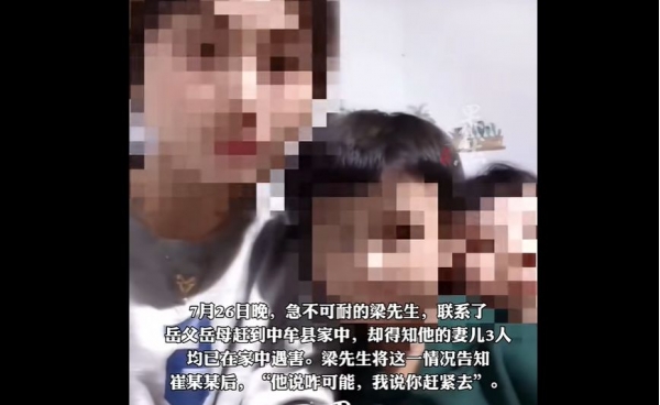 7月26日晚,梁先生实在放心不下,联系了岳父岳母赶到中牟县家中,却得知他的妻儿3人均已在家中遇害。