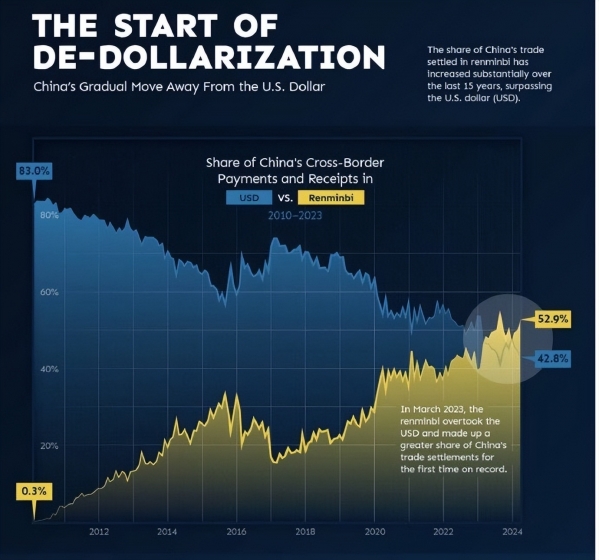 而在2010年,人民币跨境交易支付的份额接近 0%,但是,现在是53%。