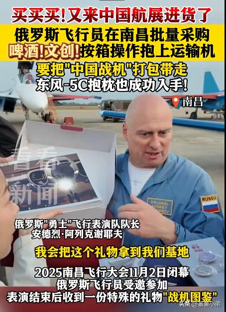 11月2日南昌飞行大会刚落幕,俄罗斯"勇士"飞行表演队的苏-35S战机还没冷却引擎,飞行员们就集体冲进纪念品区开启"采购模式"。徽章、手提包、飞机模型被成批装袋,最抢眼的是整箱本土啤酒--有人左右手各拎三箱,边走边笑:"回莫斯科的航程正好解渴!"