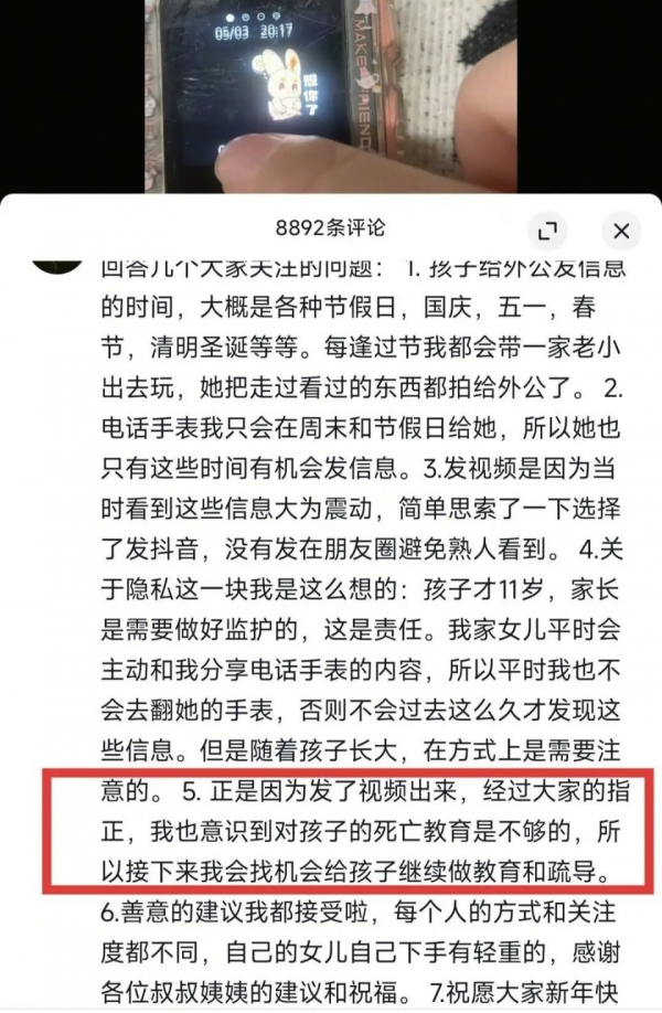 "正是因为发了视频出来,经过大家的指正,我也意识到对孩子的死亡教育是不够的。"这位母亲通过私信回复封面新闻记者,接下来会找机会给孩子继续做教育和疏导。"告诉她想外公的时候可以看看天上,继续给外公发消息也可以的,主要是要珍惜身边的亲人。"