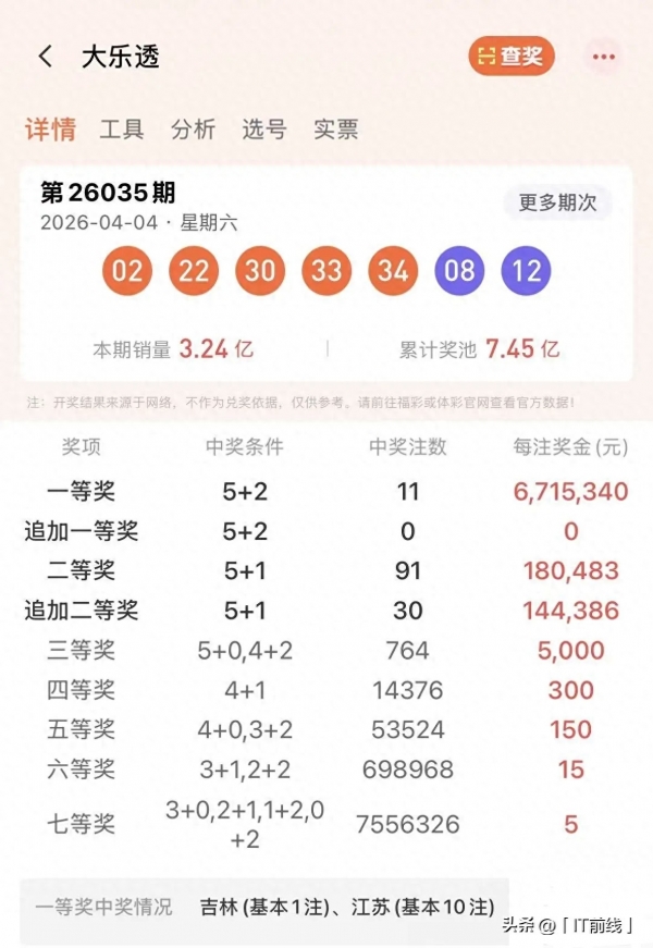 4月4日晚,体彩大乐透第26035期开奖结果出炉,当期开出前区号码02、22、30、33、34,后区号码08、12。这组号码直接送出11注一等奖,单注奖金高达671.534万元,其中10注头奖全部归属江苏,仅1注由吉林彩民获得,瞬间在彩民圈引发广泛讨论。