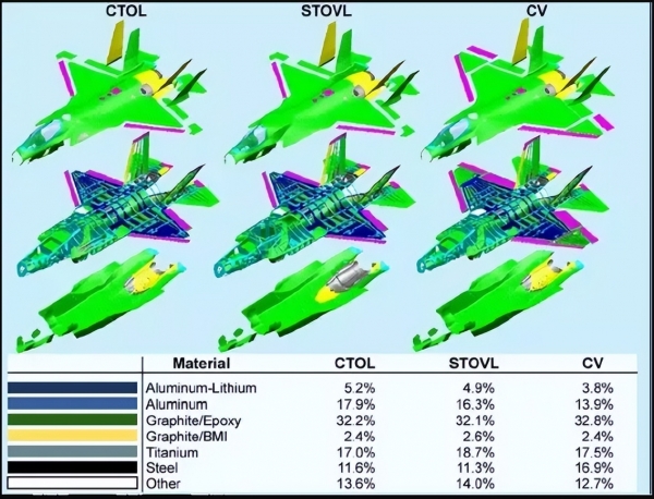 与歼35相比,美军F-35的复合材料使用比例稍低,其占比达到了约36%,采用的是T-800级的碳纤维配合第一代树脂基体成型的复材,在当时那个年代确实无比先进。