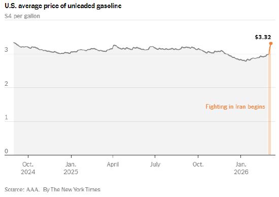 在美国与以色列联手对伊朗发起军事行动后的一周内,油价连续上涨。周五,美国汽油均价上涨 7 美分,达到每加仑3.32 美元。