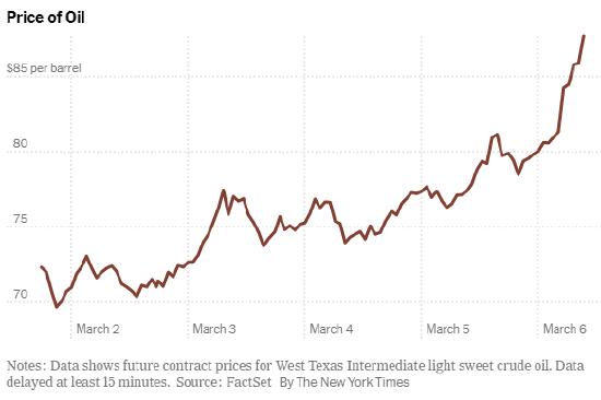 能源价格暴涨的原因是:战事导致波斯湾石油与天然气运输受阻,伊朗也威胁要袭击试图通过这一关键狭窄航道的油轮。