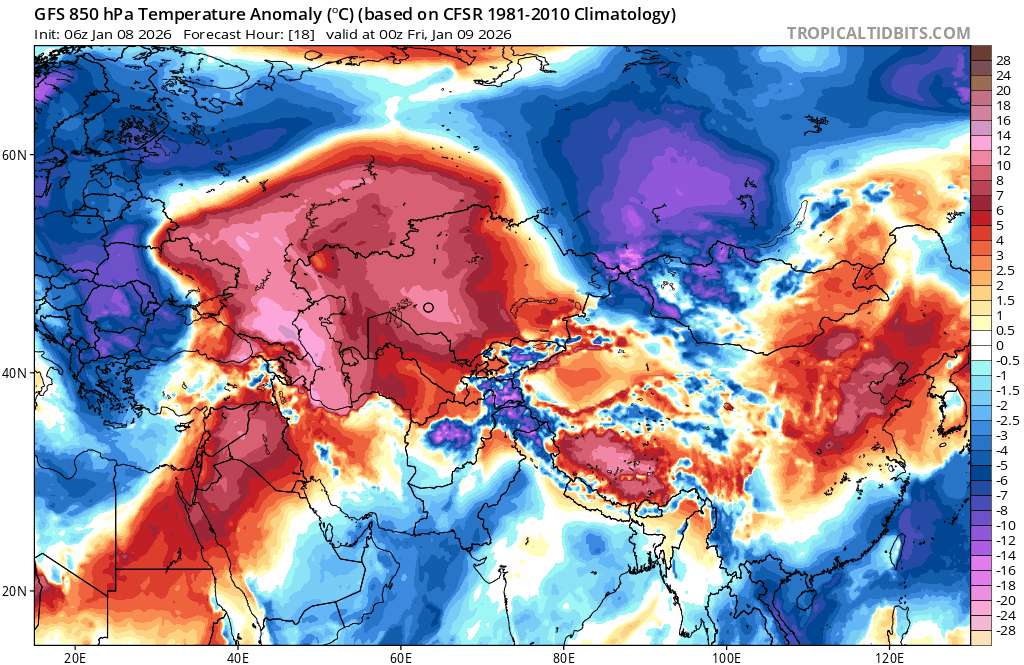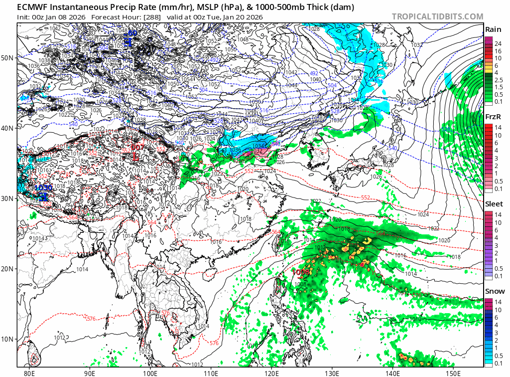 但以上这种异常回暖天气将要在中旬末开始迎来暂停局面。我国高层经向度将要逆转,届时北部阻高系统打通,配和中亚地区(图兰平原)低涡系统打通帮忙,引导南支槽加强向我国内陆输送力度,加上横槽下摆转竖汇合,对应以上配套引导背景下,届时,我国中东部将迎来一次大范围较强雨雪以及冻雨等复杂天气过程。当然以上预报还为时过早,具体还有待观察下去。